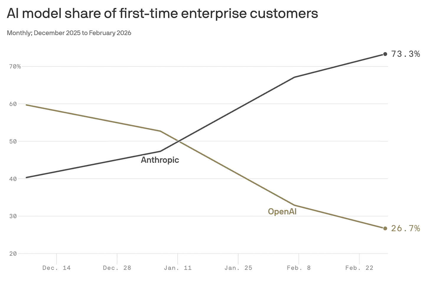 73% מההוצאות של חברות שרוכשות כלי AI בפעם הראשונה הולכות לאנתרופיק. לפי נתוני Ramp, פלטפורמת ניהול הוצאות שמשמשת אלפי חברות בארה”ב, לפני 10 שבועות בלבד החלוקה בין Anthropic ל-OpenAI הייתה 50-50. לפני שלושה חודשים בלבד התמונה הייתה הפוכה עם יתרון של 60-40 לטובת OpenAI.