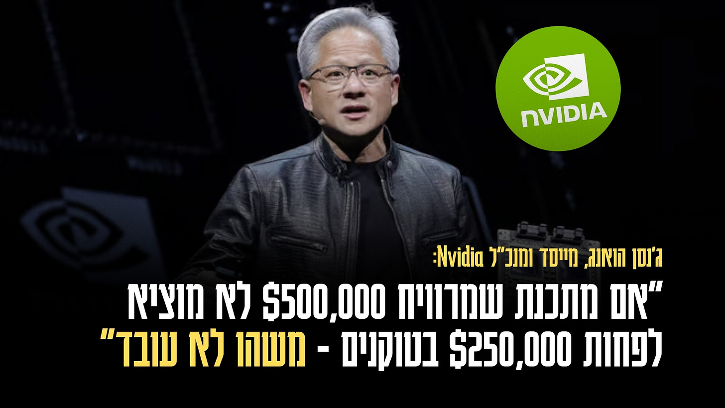 ״אם מפתח אצלי מרוויח 500,000 דולר בשנה ועד סוף השנה הוא השתמש רק ב-5,000 דולר בטוקנים, אני אתהפך עליו (תרגום חופשי). ואם תקציב הטוקנים שלו לא לפחות 250,000 דולר - אני מודאג מאוד״, אמר ג’נסן הואנג, מנכ”ל Nvidia, בשיחה בפודקאסט All-In בכנס ה-GTC השבוע.
